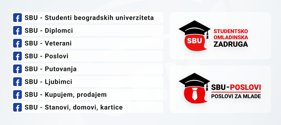 - SBU Studentski i omladinski poslovi – namenjena je studentima koji su u potrazi sa studentskim poslovima i stručnim praksama, kao i firmama i omladinskim zadrugama koje nude studentske poslove: www.facebook.com/groups/SBU.Poslovi
